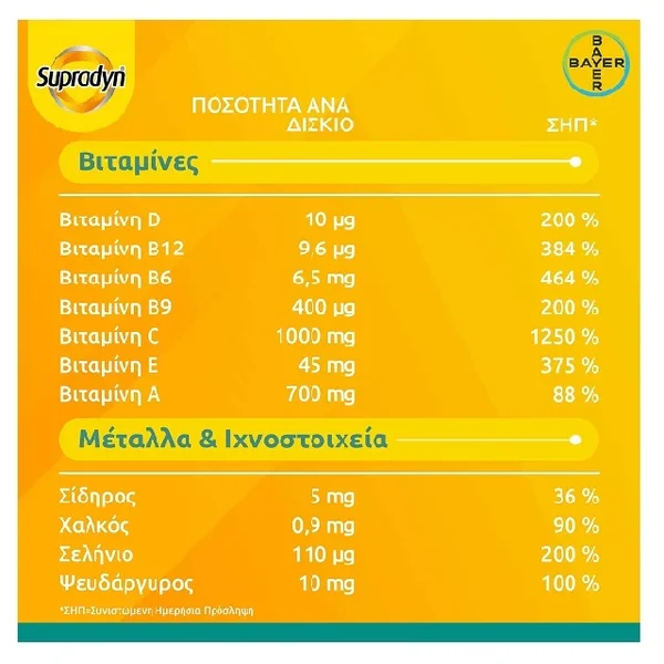 *Οι βιταμίνες Α, C, D, Β6, Β9, Β12, ο ψευδάργυρος ο σίδηρος και το σελήνιο συμβάλλουν στη φυσιολογική λειτουργία του ανοσοποιητικού συστήματος. Οι βιταμίνες Ε και C, ο ψευδάργυρος, ο χαλκός και το σελήνιο συμβάλλουν στην προστασία των κυττάρων από το οξειδωτικό στρες, ενώ οι βιταμίνες B12, B6, Β9, C και ο σίδηρος συμβάλλουν στη μείωση της κούρασης και της κόπωσης.