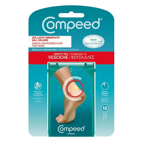 Μεσαίο επίθεμα για φουσκάλες με 10 επιθέματα ανά συσκευασία. Tα μεσαία επιθέματα για φουσκάλες Compeed® απορροφούν την περιττή υγρασία και σχηματίζουν ένα προστατευτικό μαξιλάρι προσφέροντας άμεση ανακούφιση από τον πόνο και ιδανικές συνθήκες για την επούλωση των φουσκαλών του ποδιού.