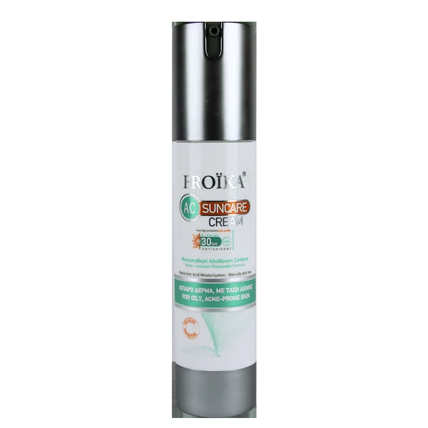 Η Suncare AC Cream SPF 50+ είναι μια μη λιπαρή αντιηλιακή κρέμα με πολύ υψηλό δείκτη προστασίας κατάλληλη για λιπαρό δέρμα με τάση ακμής καθώς και για ξηρότητα και ερεθισμούς μετά από φαρμακευτικές θεραπείες. Απορροφάται άμεσα χωρίς να αφήνει υπολείμματα και λιπαρότητα στο δέρμα προσφέροντας μια ευχάριστη αίσθηση ”γυμνού δέρματος’’ – nude skin sensation. Έχει σμηγματορυθμιστική και κερατορυθμιστική δράση καθώς ρυθμίζει την έκκριση σμήγματος και αποτρέπει την οξείδωση των λιπιδιών του, αποτρέποντας έτσι την εμφάνιση ατελειών.