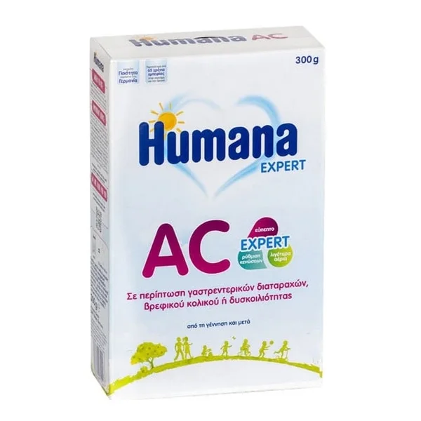 To Humana AC είναι μια ειδική τροφή κατάλληλη για τη διαιτητική αντιμετώπιση προβλημάτων πέψης, που οφείλονται σε διατροφικές ή ηλικιακές αιτίες στα μωράκια, όπως είναι οι κολικοί και τα φουσκώματα.