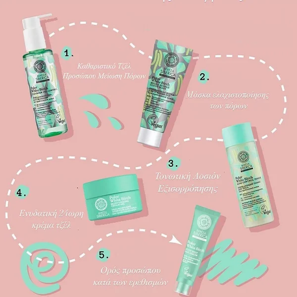 Η νέα σειρά Natura Siberica, με βάση τον υδρολύτη της λευκής σημύδας. Εμπλουτισμένο με ισχυρά φυτά της Σιβηρίας που επιβιώνουν στο σκληρό κλίμα στη Σιβηρία και ως εκ τούτου έχουν σπάνιες ιδιότητες