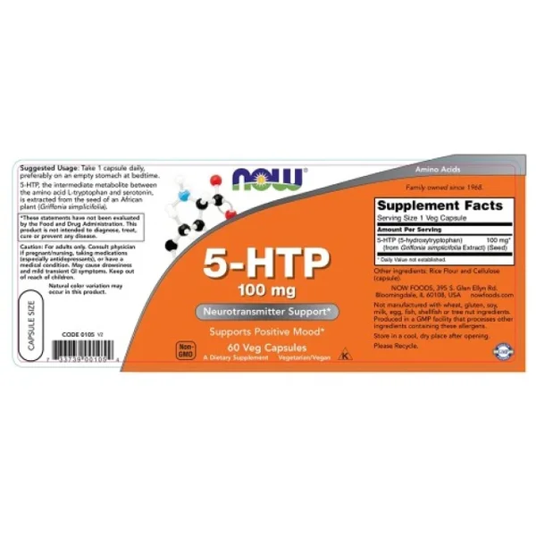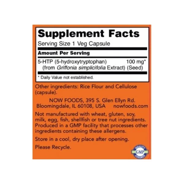 To 5-HTP 100 mg της Now είναι ένα συμπλήρωμα διατροφής με 5-υδρόξυτρυπτοφάνη (5-hydroxytryptophan). Η 5-HTP αποτελεί την υδροξυλιωμένη μορφή του αμινοξέως τρυπτοφάνη, το οποίο υπάρχει σε τρόφιμα όπως το κρέας, τα γαλακτοκομικά και λοιπά πρωτεϊνούχα.